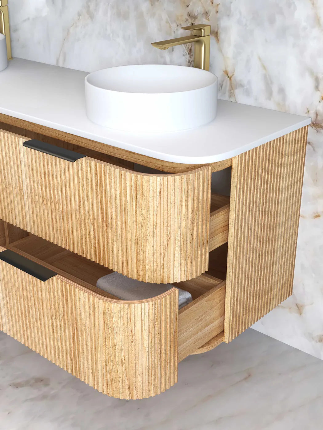 Bring natural warmth and refined texture to your bathroom with the Havana Wall Hung Fluted Curve Vanity by Otti Australia. Crafted with a tactile fluted timbergrain finish in rich Woodland Oak & Walnut this wall-hung vanity is the perfect statement piece for both modern and timeless interiors.The Stone Top with both 12mm Moulded Top with chloe silk colour and 50mm English edge Top with Sand Dune colour.