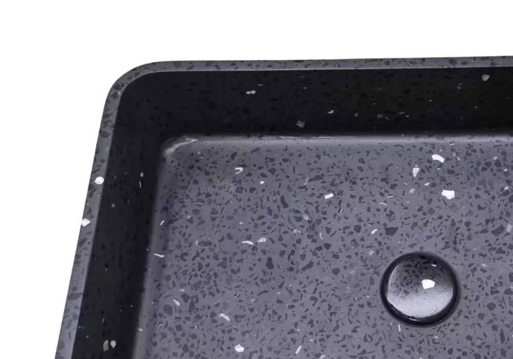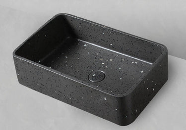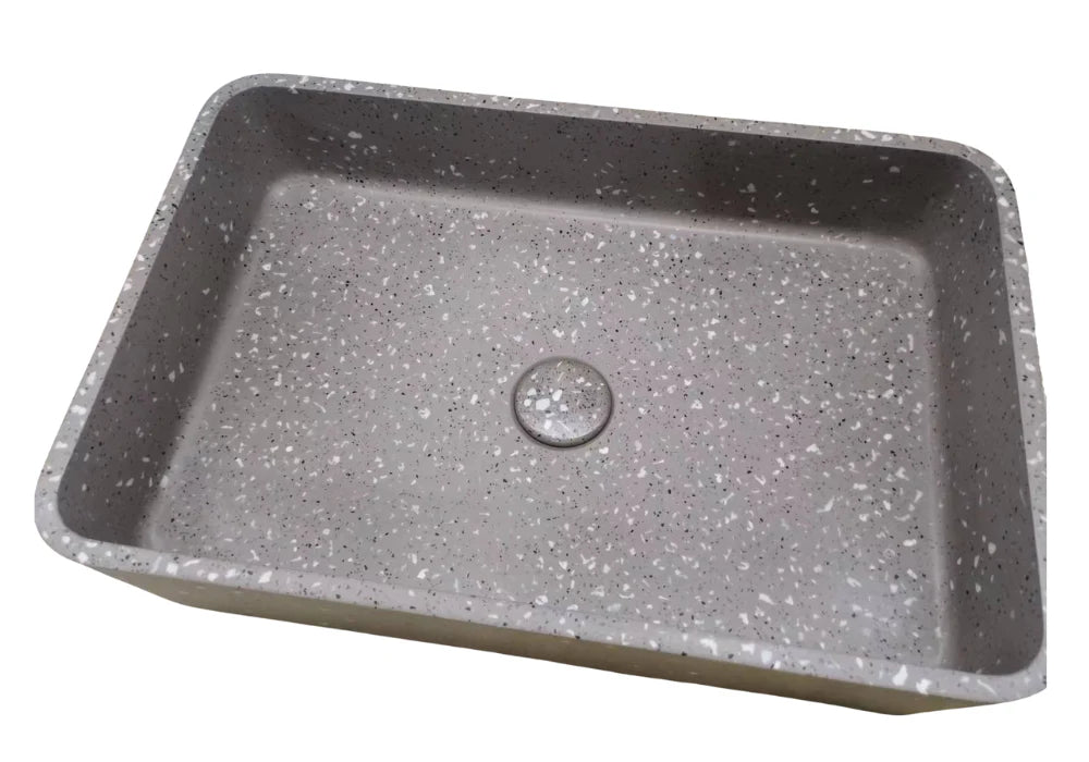 A rectangular shaped benchtop basin in a grey terrazzo. This basin can be placed on a custom vanity benchtop from the Bella range.