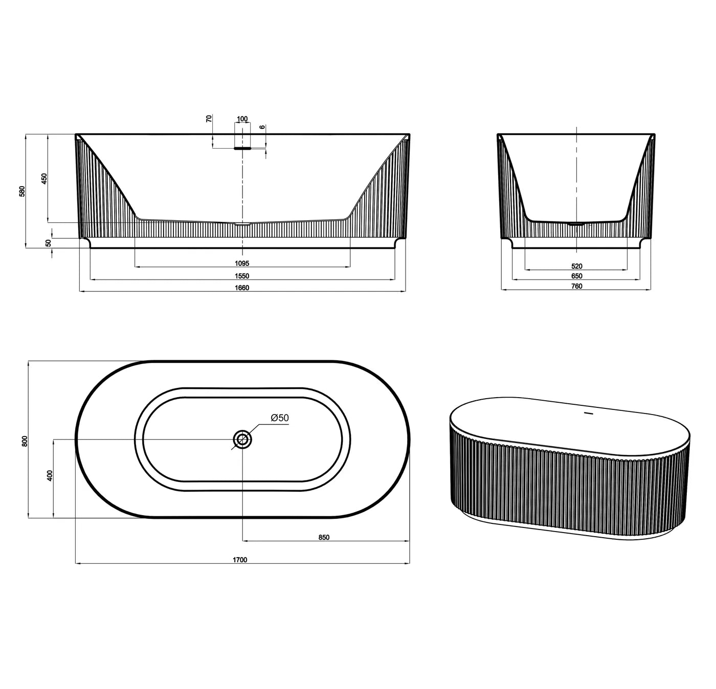 Havana Fluted Bathtub with Overflow | Otti