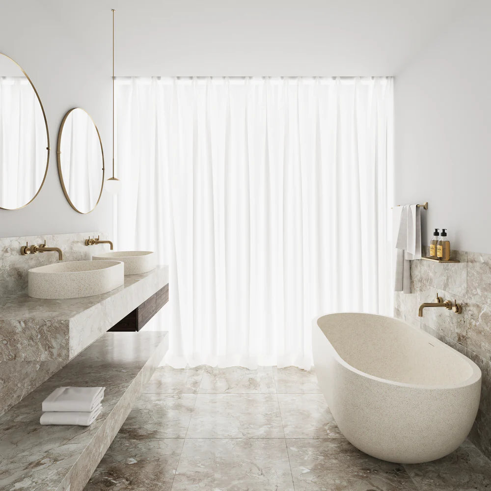 Indulge in the opulence of Madu Living with the contemporary freestanding Indy bath, a timeless oval design that exudes both elegance and functionality. Handcrafted from natural composite stone, the Indy tub features unique finishes that create an unparalleled, one-of-a-kind aesthetic, transforming your bathroom into a serene masterpiece. Its seamless blend of style and practicality allows it to effortlessly integrate into any existing decor, making it the perfect choice for those seeking luxury and comfort. Additionally, the Indy bath features a void underneath, offering space for the installation of a flexidinger if required. These can be ordered on request through us by contacting our team.