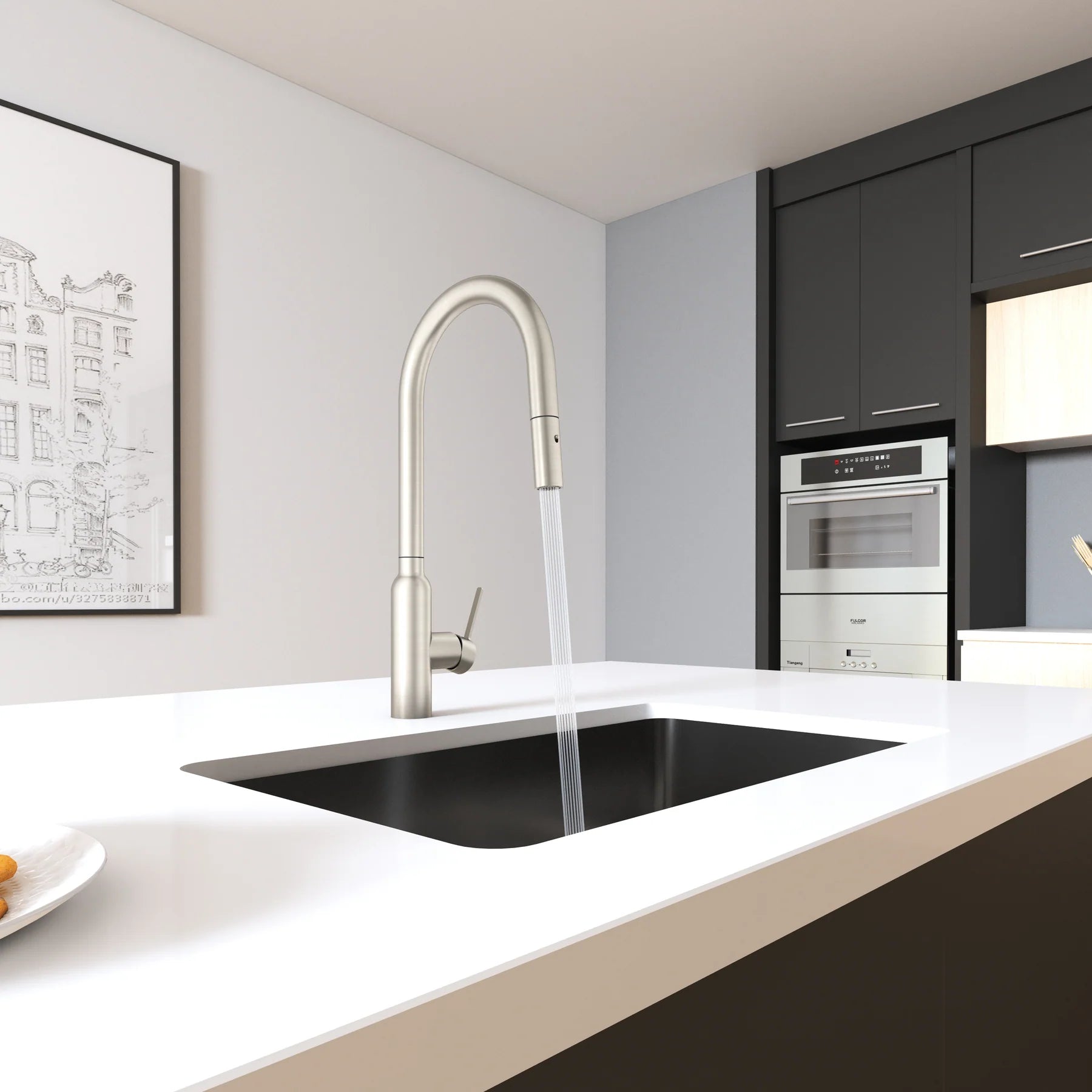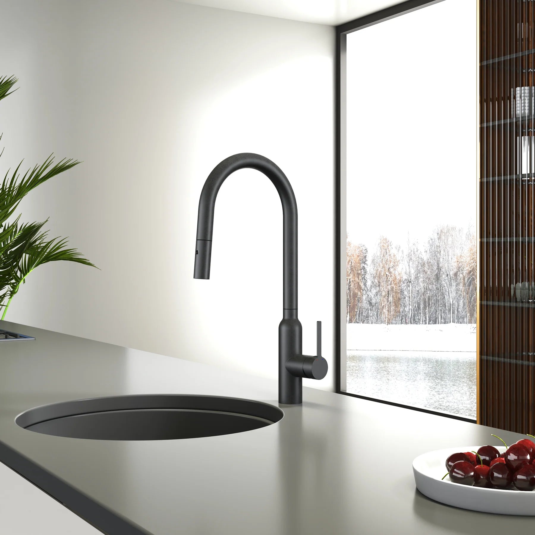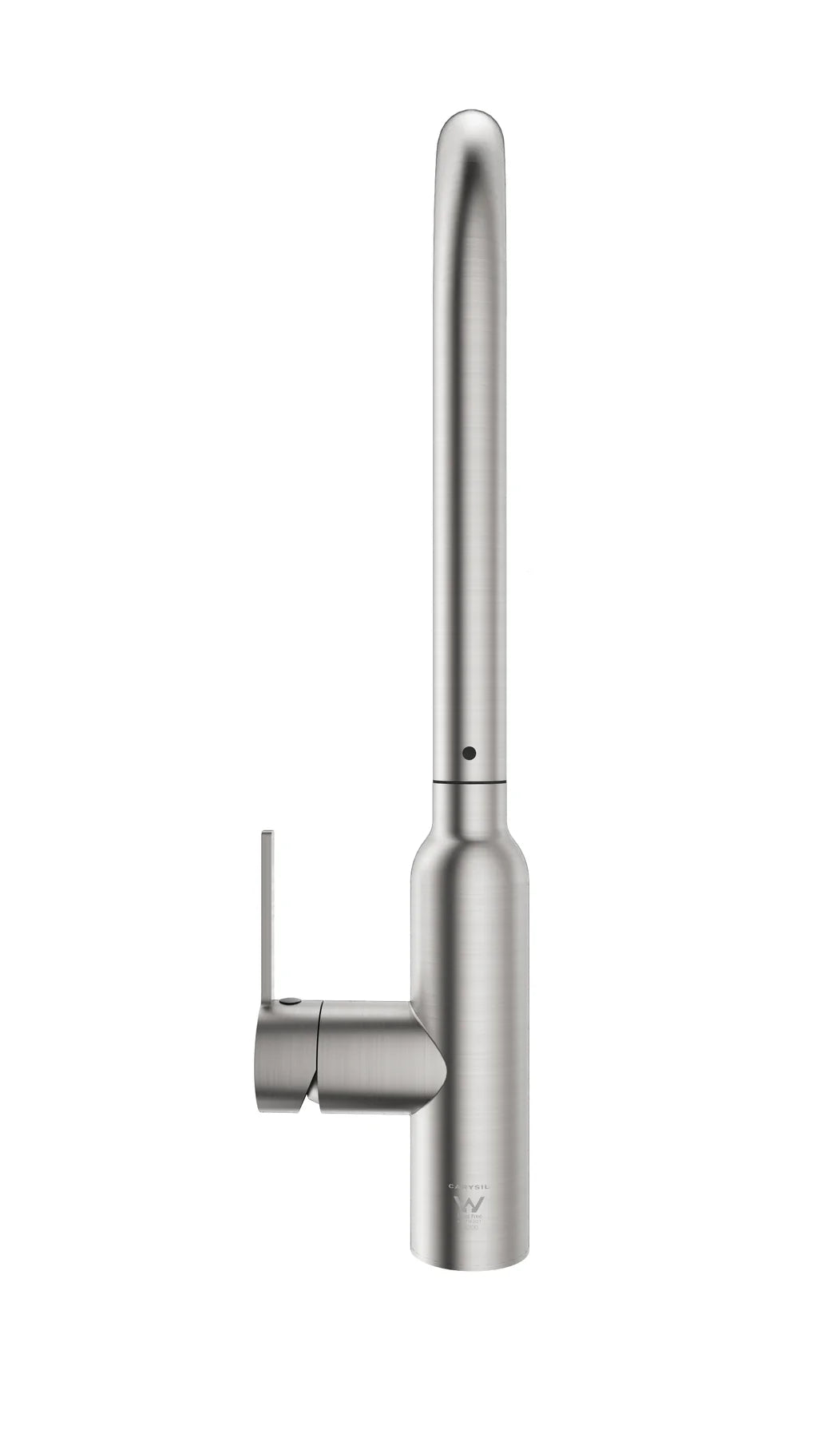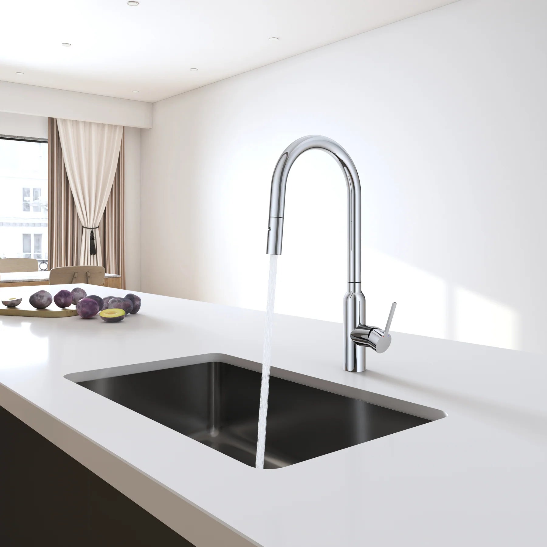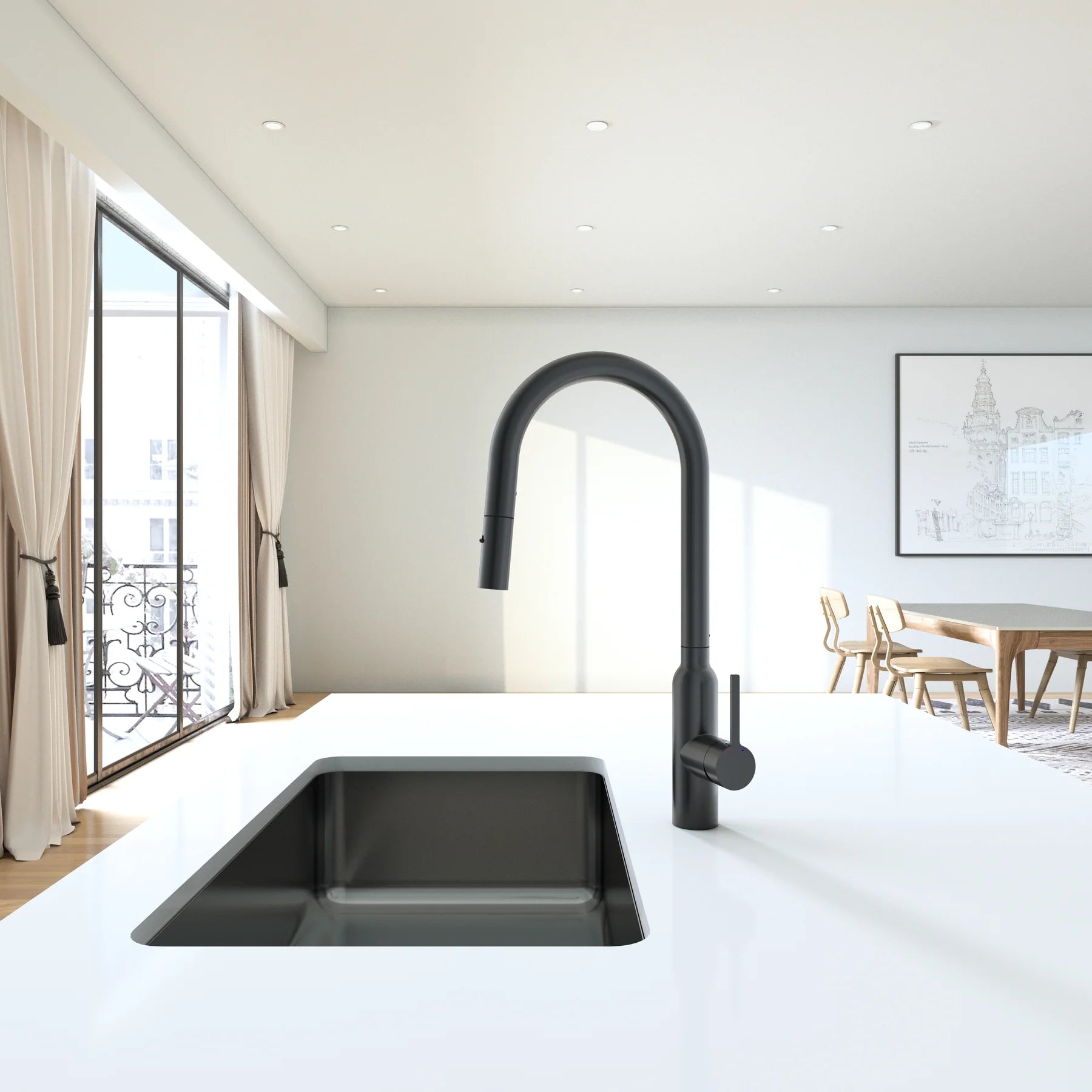 Premium pull-out kitchen faucet with a modern angled spout design, crafted for both style and functionality. The flexible pull-out hose and 360° swivel spout provide precise water control, making daily cleaning effortless and efficient. Built with internationally recognised components to ensure smooth performance and long-term reliability.