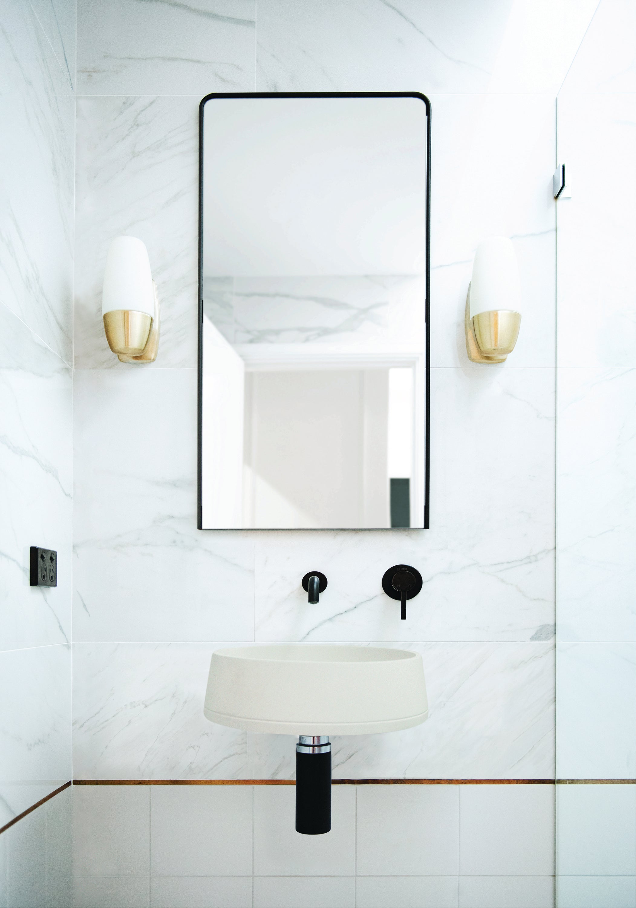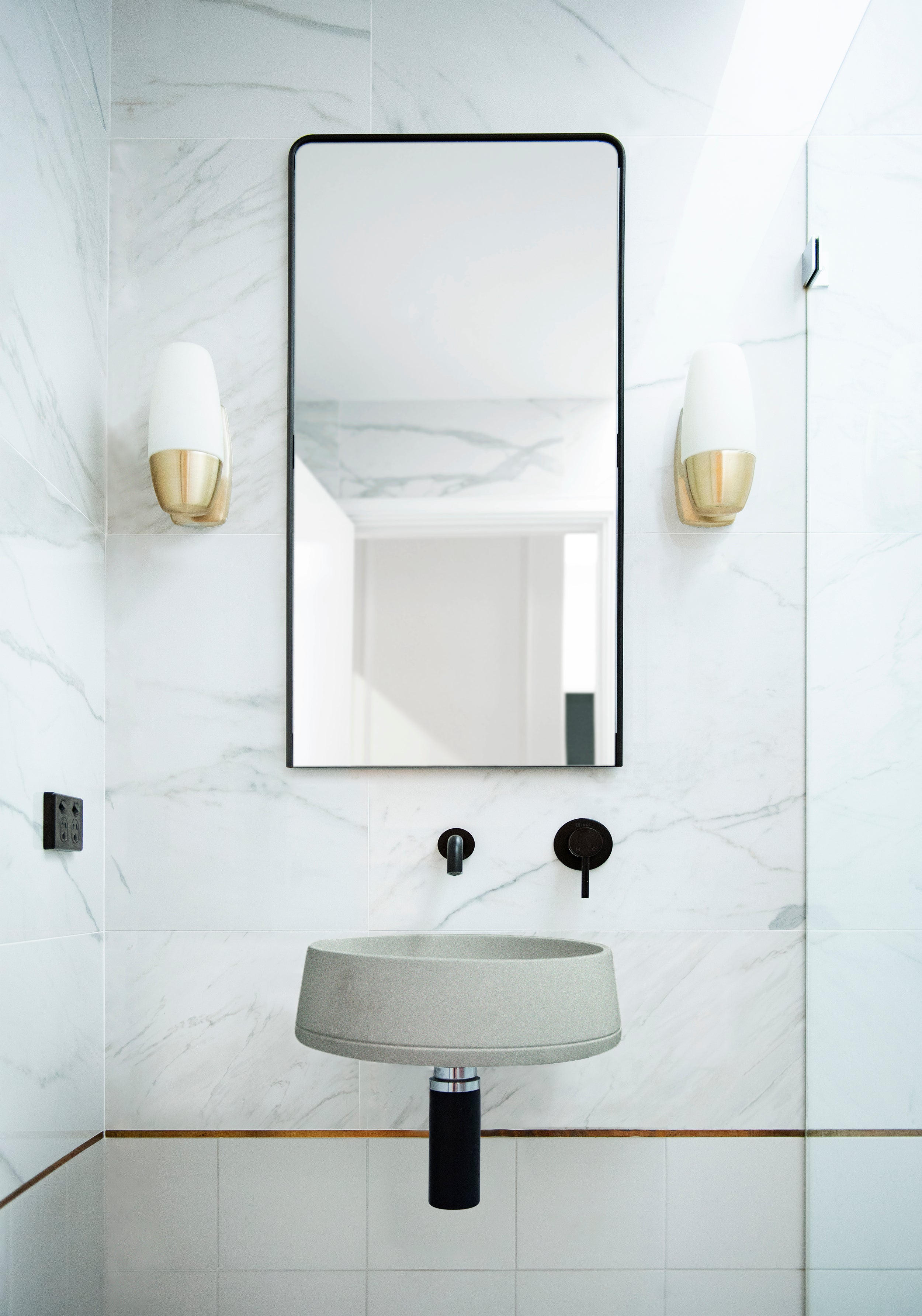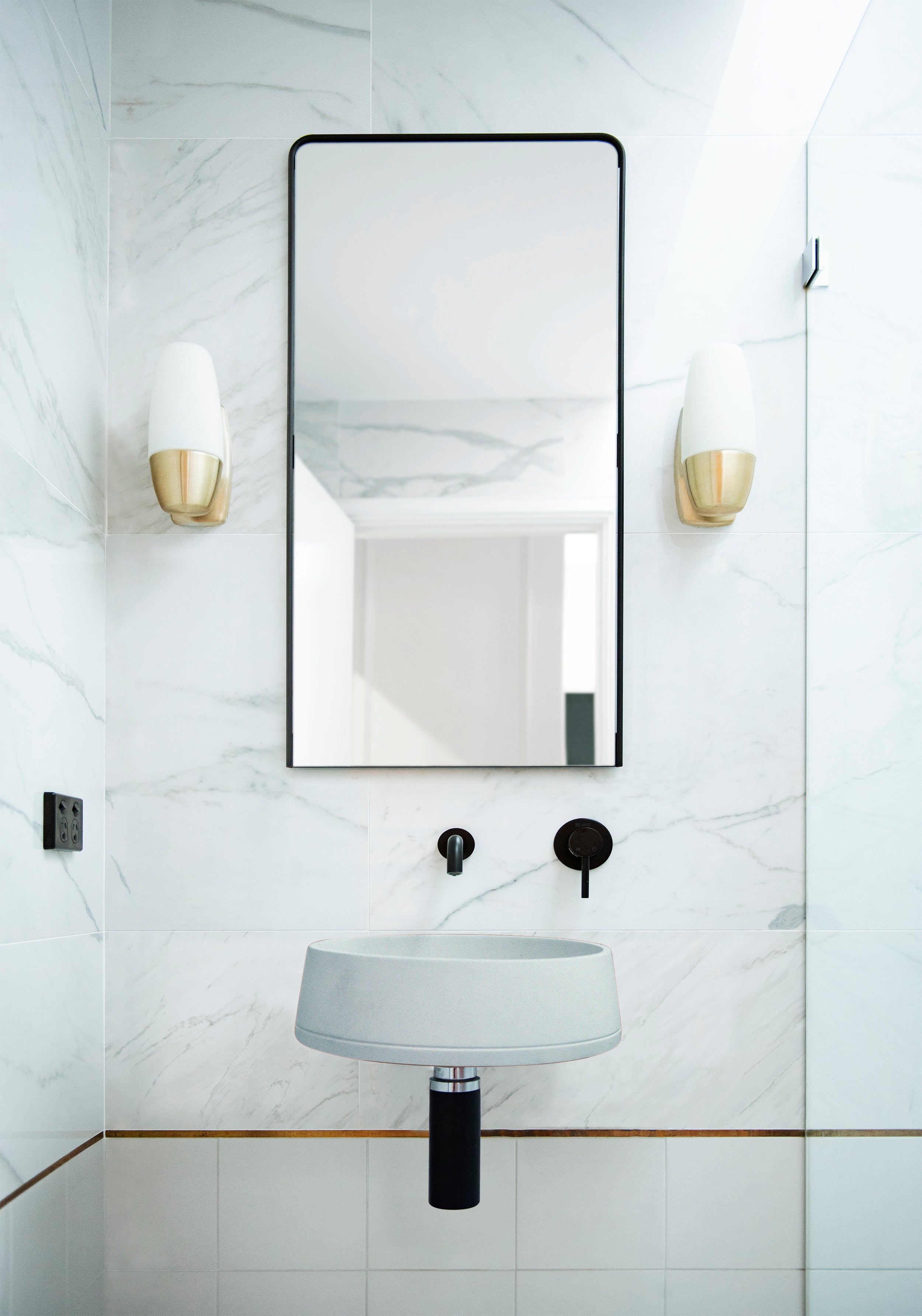 These gorgeous angled walls funnel down to a squared base to create an elegant bathroom masterpiece.