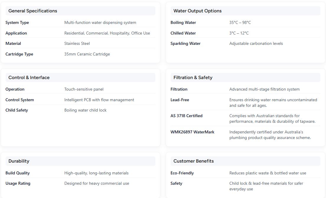 - Boiling Water on Demand Instant 98°C water perfect for coffee, tea, soups, and speeding up everyday cooking.