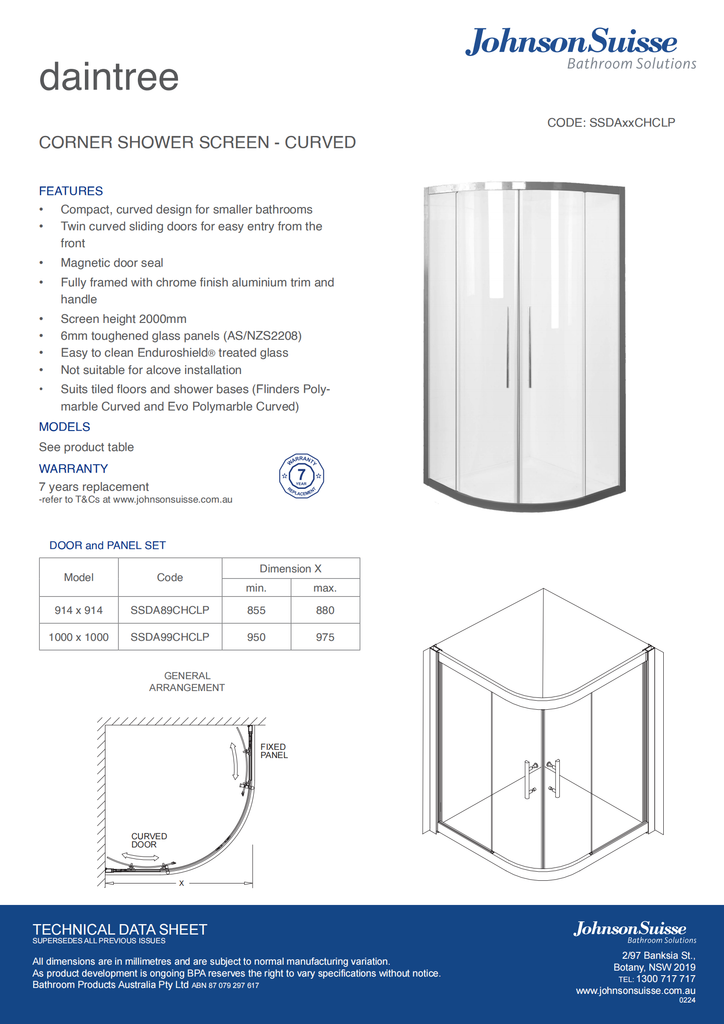 Daintree Curved Shower Screen - 914/1000mm | Johnson Suisse