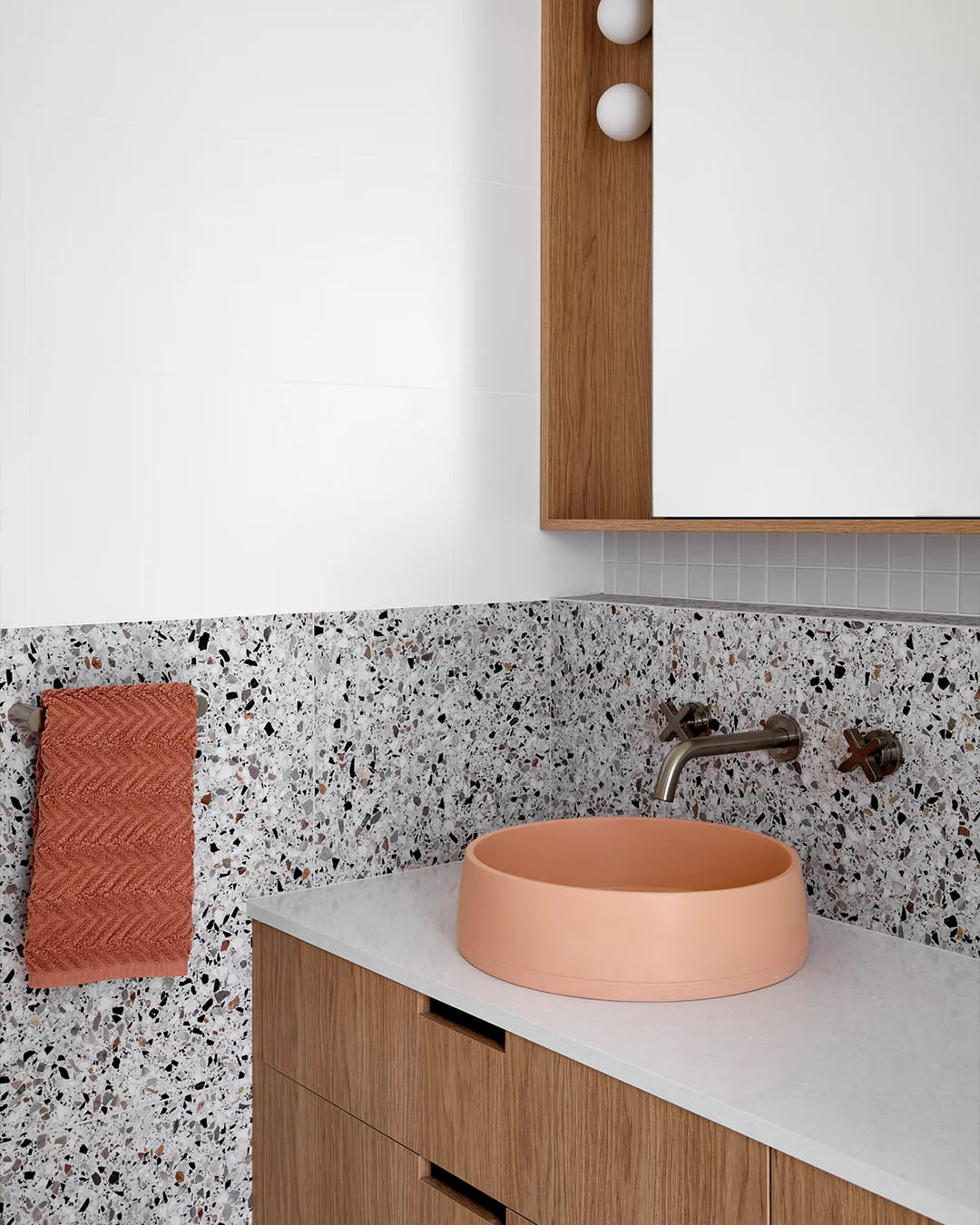 These gorgeous angled walls funnel down to a squared base to create an elegant bathroom masterpiece.